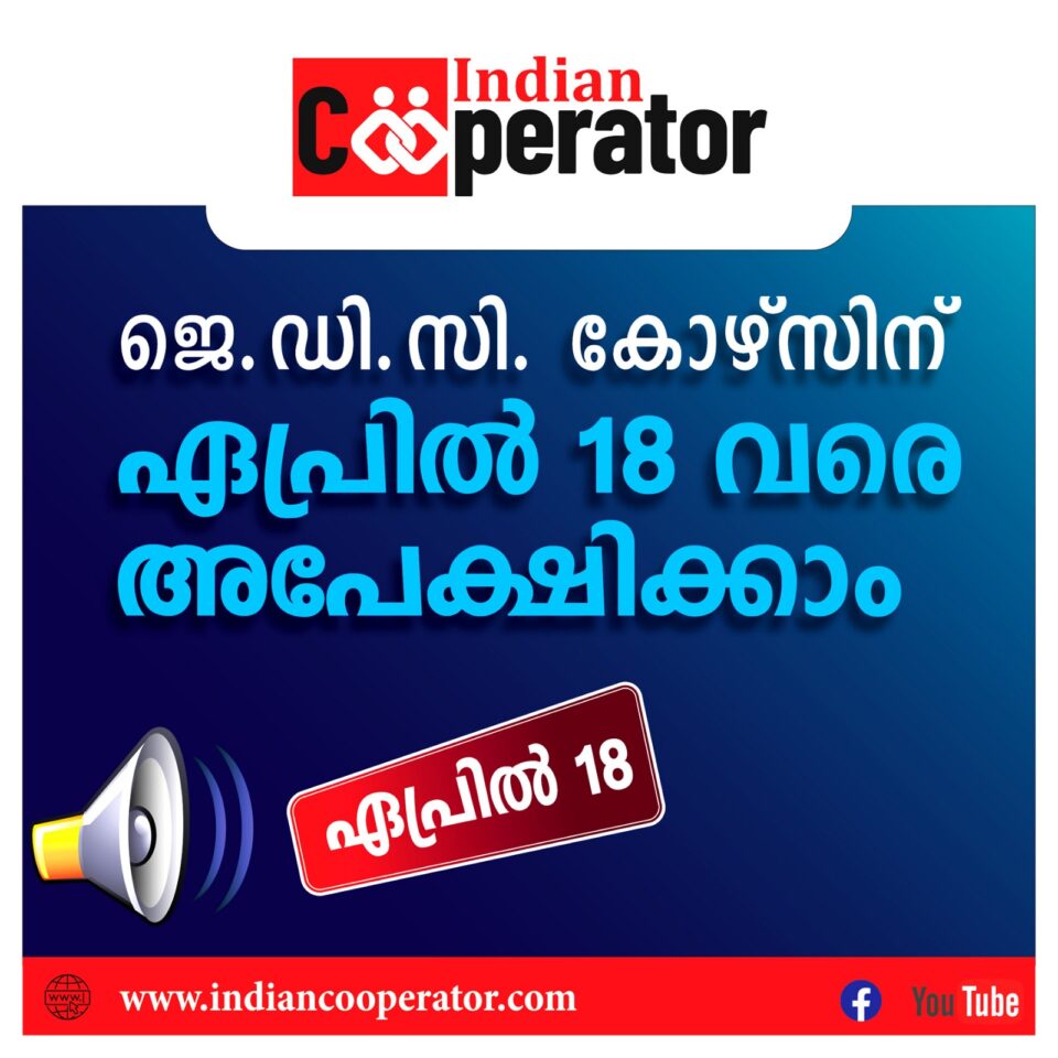 സംസ്ഥാന സഹകരണയൂണിയന്റെ നിയന്ത്രണത്തിലുള്ള സഹകരണ പരിശീലനകേന്ദ്രങ്ങളിലേക്കും കോളേജുകളിലേക്കും 2026-27 വര്ഷത്തെ ജൂനിയര് ഡിപ്ലോമ ഇന് കോ-ഓപറേഷന് ( ജെ.ഡി.സി ) കോഴ്സിലേക്കു മാര്ച്ച് 16 മുതല് ഓണ്ലെനായി അപേക്ഷിക്കാം. എസ്.എസ്.എല്.സി, സി.ബി.എസ്.ഇ, ഐ.സി.എസ്.ഇ. യോ തത്തുല്യമായി അംഗീകരിച്ചിട്ടുള്ള പരീക്ഷയോ പാസായിരിക്കണം.