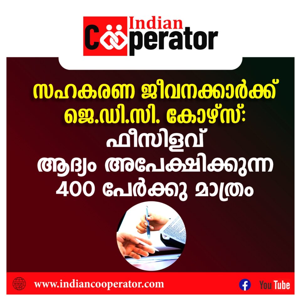സംസ്ഥാന സഹകരണയൂണിയനു കീഴിലുള്ള പരിശീലനകേന്ദ്രങ്ങളില്നിന്നു ജൂനിയര് ഡിപ്ലോമ ഇന് കോ-ഓപറേഷന് ( ജെ.ഡി.സി ) കോഴ്സ് വിജയകരമായി പൂര്ത്തിയാക്കുന്നവര്ക്കു കോഴ്സ്ഫീസിലും പരീക്ഷാഫീസിലും ഇളവു നല്കുന്നതിനുള്ള യോഗ്യതാമാനദണ്ഡങ്ങള് നിശ്ചയിച്ചുകൊണ്ട് സഹകരണരജിസ്ട്രാര് ഉത്തരവിറക്കി. സഹകരണസംഘം രജിസ്ട്രാറുടെ ഭരണനിയന്ത്രണത്തിലുള്ള സഹകരണസ്ഥാപനങ്ങളിലെ ഉദ്യോഗസ്ഥര്ക്കേ ഇളവ് കിട്ടൂ. ഓരോ വര്ഷവും മുന്ഗണനാക്രമമനുസരിച്ച് ആദ്യം കിട്ടുന്ന 400 അപേക്ഷകര്ക്കുമാത്രമാണ് ഈയാനുകൂല്യം നല്കുന്നത്. കോഴ്സ് വിജയിച്ചശേഷം കോഴ്സ്ഫീസ്്, പരീക്ഷാഫീസ് എന്നിവ ഇളവായോ ഗ്രാന്റായോ അനുവദിക്കും. സഹകരണസംഘം രജിസ്ട്രാറുടെ പേരില് കേരള ബാങ്കില് നിക്ഷേപിച്ചിട്ടുള്ള പ്രൊഫഷണല് എഡ്യുക്കേഷന് ഫണ്ടില്നിന്നു ഫീസിളവിനുള്ള തുക അനുവദിക്കാന് ഫണ്ട്സ്കീം പ്രകാരമുള്ള ഉന്നതതലയോഗമാണു തീരുമാനമെടുത്തത്.
