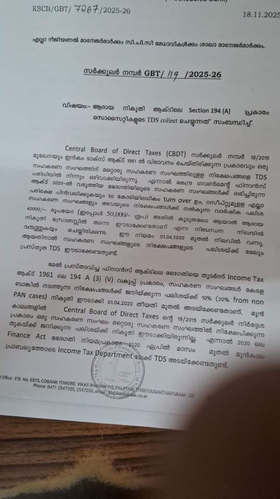 50 കോടിയിലധികം ടേണ് ഓവറുള്ള സഹകരണ സ്ഥാപനങ്ങള് അവിടുത്തെ നിക്ഷേപത്തില് ജനിക്കുന്ന പലിശയ്ക്ക് നികുതി പിടിക്കണമെന്നാണ് നിയമത്തിലെ വ്യവസ്ഥ. കേരളാബാങ്കിന് 50 കോടിയിലധികം ടേണ് ഓവറുണ്ട്. അതിനാല്, അവിടുത്തെ സംഘങ്ങളുടേത് അടക്കമുള്ള നിക്ഷേപത്തിന് ടി.ഡി.എസ്. പിടിച്ചുകൊടുക്കേണ്ട ബാധ്യത കേരളാബാങ്കിനുണ്ടാവും. ഇക്കാര്യമാണ് കേരളാബാങ്കിന്റെ സര്ക്കുലറിലും പറയുന്നത്. വാര്ഷിക പലിശ 50,000 രൂപയില് കൂടുകയാണെങ്കിലാണ് ടി.ഡി.എസ്. പിടിക്കേണ്ടത്. സഹകരണ സംഘങ്ങള്ക്ക് കേരളാബാങ്കില് മാത്രമാണ് നിക്ഷേപം നടത്താന് പാടുള്ളൂ. അതിനാല്, ആ നിക്ഷേപത്തില് ജനിക്കുന്ന പലിശ 50,000 രൂപയില് കൂടുതലായിരിക്കും. ഫലത്തില് എല്ലാ പ്രാഥമിക സംഘങ്ങള്ക്കും ഇനി ടി.ഡി.എസ്. നല്കേണ്ടിവരും.